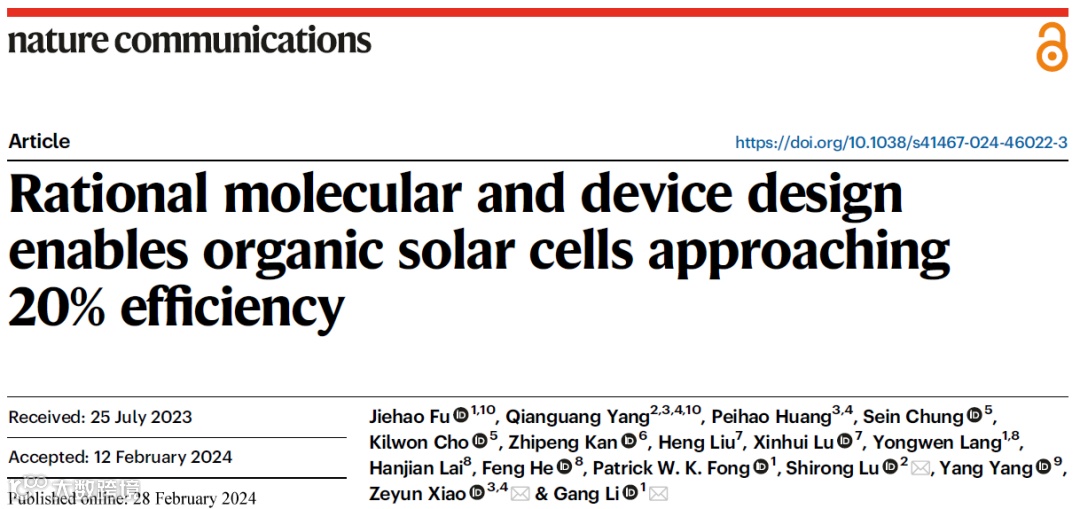 理性分子和器件设计实现接近20%光电转换效率有机太阳能电池