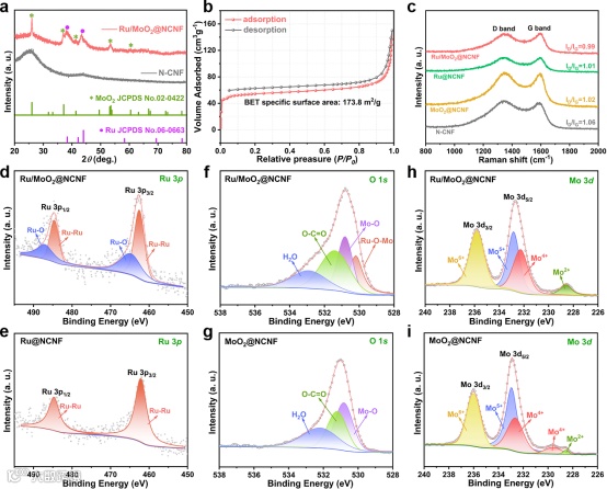 XRD结果证明了Ru/MoO2@NCNF样品中同时含有Ru和MoO2的物相。BET和拉曼测试结果表明了Ru/MoO2@NCNF具有较大的比表面积(173.8 m2·g-1)和良好的导电性,有利于暴露更多的活性位点和促进电子转移。XPS结果进一步证明了界面电子转移方向是Ru→MoO2,与功函数计算结果一致。O 1s XPS图谱证明了Ru和MoO2界面处形成了界面Ru-O-Mo桥键。