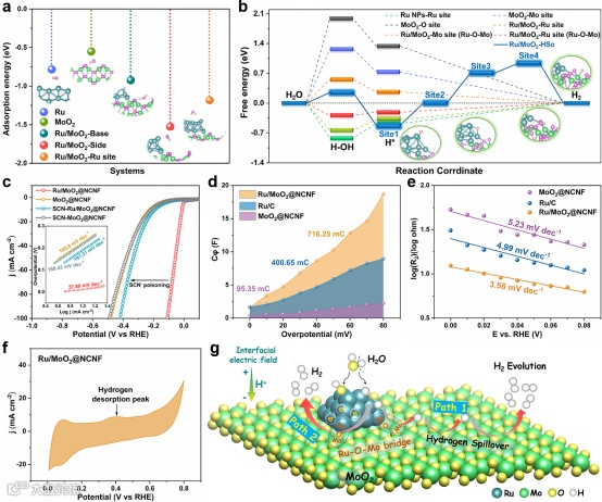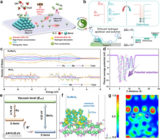 示意性地描述了氢溢流效应的反应机理以及影响因素。Ru和MoO2复合增强了费米能级处的电子态密度,显著提高了材料的导电性。二者之间的功函数差值(ΔФ=0.05 eV)表明了电子是从Ru向MoO2转移,进而改善了界面处的电子结构。