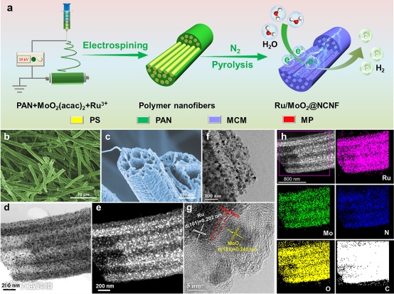 采用静电纺丝法和一步高温碳化处理制备了氮(N)掺杂碳纳米纤维负载Ru/MoO2异质结构催化剂(Ru/MoO2@NCNF)。SEM和TEM表征证明了Ru/MoO2@NCNF具有明显的多通道结构,且Ru/MoO2纳米颗粒在多孔碳纤维表面均匀分布,没有发生明显的团聚现象。EDX元素面分布图证明Ru、Mo、N、O和C元素均匀分布。