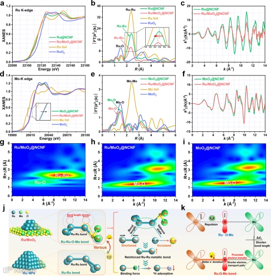 通过XAFS表征了形成Ru/MoO2异质结构后Ru和Mo原子的价态变化。由Ru的FT-XANES光谱可知Ru-Ru键长发生缩短,使得Ru-Ru金属键得到强化,金属键对自由电子的束缚能力增强,能够有利于吸附带正电的质子,促进HER催化反应过程。此外,进一步地描述了Ru-Ru金属键强化对Ru/MoO2@NCNF催化析氢性能的影响,以及Ru-O-Mo桥键的形成强化了界面处的电子转移。