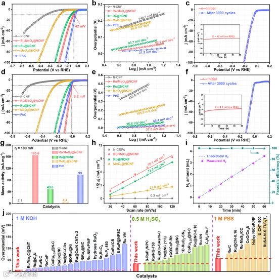 图5. 负载型Ru/MoO2复合材料的全pH范围HER特性