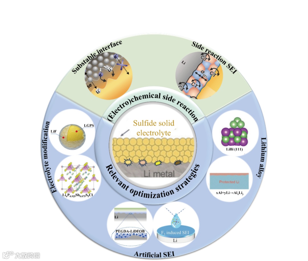 图1.硫化物固态电解质与锂阳极的界面(电)化学副反应的示意图以及针对二者界面(电)化学副反应的相应优化策略。