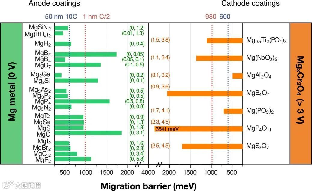 图9. 阳极(左)和正极(右)候选涂层的计算迁移势垒。虚线垂直线表示严格阈值(10600 meV,蓝色)和宽松阈值(10980 meV,红色)Emmax值。括号中的数字提供对镁的(还原,氧化)电位稳定性限值
