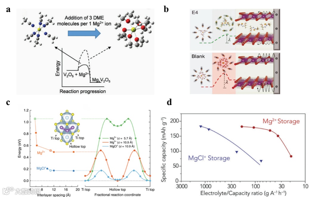 图7. (a)添加DME后Mg(ClO4)2/ACN电解质中溶剂化结构的变化;(b)MgxMnO2正极主体中协同离子和电子转移的示意图;(c)Mg2+和MgCl+在具有不同层间距的TiS2中扩散的能量分布;(d)在贫电解质条件下Mg2+和MgCl+储存的性能比较