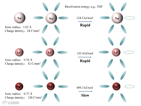 图2. Na+、Li+和Mg2+的离子半径、电荷密度和去溶剂化能的比较