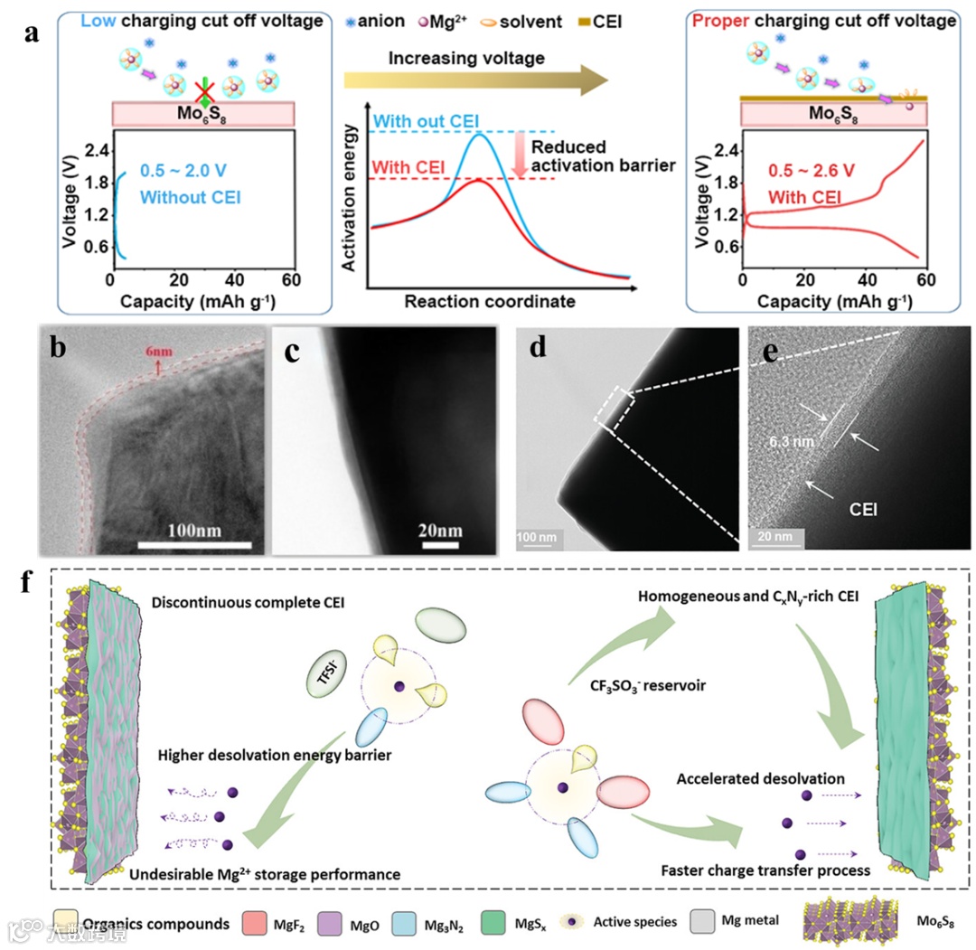 图6. (a)在适当充电截止电压下由Mg[B(hfip)4]2基电解质产生的CEI的功能示意图和(b-c)典型的TEM图像;(d-e)典型的TEM图像和(f)CEI形态、组成以及具有MOEA共溶剂的Mg(CF3SO3)2基电解质中Mo6S8正极上相应的Mg2+界面传输行为
