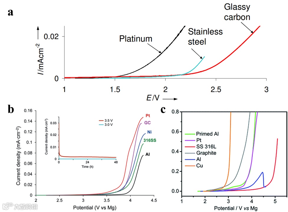 图8. (a)Mg(BH4)2/THF,(b)Mg(CB11H12)2/G4(插图:在316 SS圆盘电极上的计时电流法(面积=1.33 cm2)),和(c)Mg[B(hfip)4]2/DME在不同电极上以5 mV s-1的扫描速率测量的线性扫描伏安图