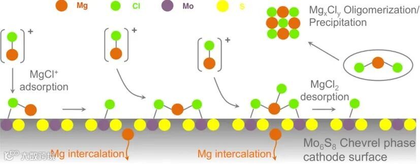 图3. 在含氯电解质中Mg2+嵌入Chevrel相Mo6S8的反应机理图