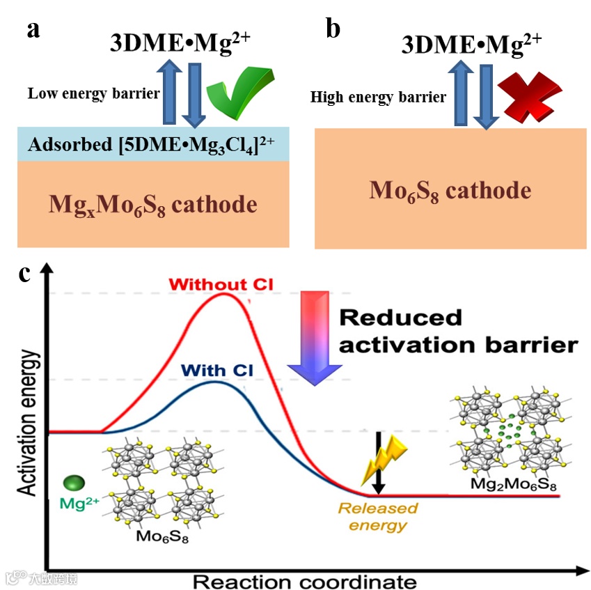 图4. Mo6S8正极的界面电荷转移过程示意图:(a)有(b)没有含氯物质,以及(c)相应的能量分布