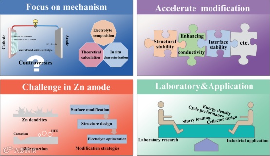 3. 锌负极侧对储能机制和器件升级也有着重要影响。要进一步提升锌–锰氧化物电池的工业应用潜力,还需要解决锌负极侧的枝晶生长、腐蚀、形变等问题。此外,锌负极的形态对锌–锰氧化物电池的设备升级有着重要的影响,也应该受到重视。