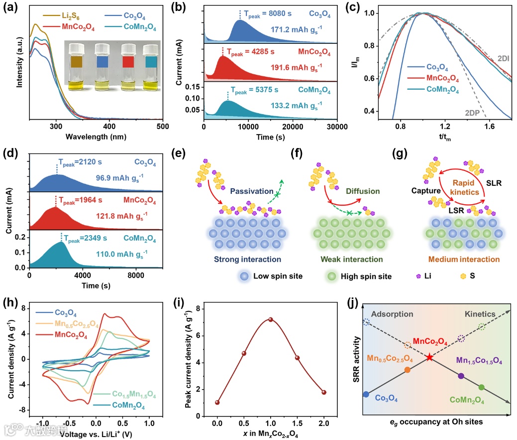 图4. a) MnxCo3-xO4吸附Li2S6溶液的紫外可见光谱。插图为放置6 h后溶液的图像。b) MnxCo3-xO4的Li2S沉积曲线。c) Li2S沉积过程的无量纲电流时间关系图。d) MnxCo3-xO4的Li2S溶解曲线。e-g) LiPSs在 MnxCo3-xO4上吸附转化机理示意图。h) 扫描速率为5 mV s−1时对称电池的CV曲线。i) 对称电池的峰值电流密度与 MnxCo3-xO4中Mn含量的函数关系。j) MnxCo3-xO4的SRR活性与Oh位点平均eg占据数的相关性。