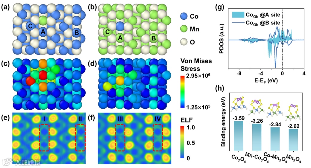 图3.基于化学力学的尖晶石氧化物表面电子结构优化方法。a) Mn掺杂Co3O4和b)Co掺杂Mn3O4的原子模型。c) Mn掺杂的Co3O4和d) Co掺杂的Mn3O4相应的von mises应力分布,单位为GPa。e) Mn掺杂的Co3O4和f) Co掺杂的Mn3O4对应的ELF图像。g) Mn掺杂的Co3O4不同位置Co的态密度。h) Li2S6与不同尖晶石氧化物的结合能。插图显示了Li2S6在不同催化剂上的优化结构。Li, S, Co, Mn和O原子分别呈紫色,黄色,蓝色,绿色和灰色。