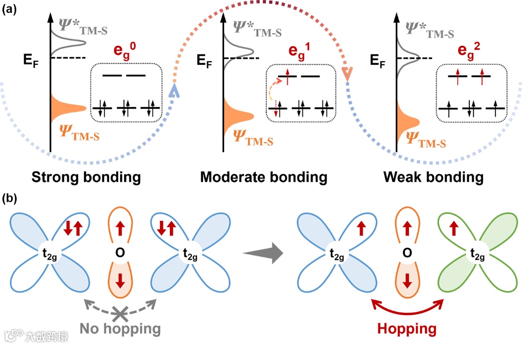 图2. eg轨道调节LiPSs吸附和转化的示意图。a) eg占据数与反键态的相关性。b) t2g轨道对电子传输的调控