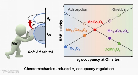 图1. 化学力学作用调节活性位点电子结构的示意图,以及尖晶石氧化物中组分-电子结构-催化活性之间的构效关系。