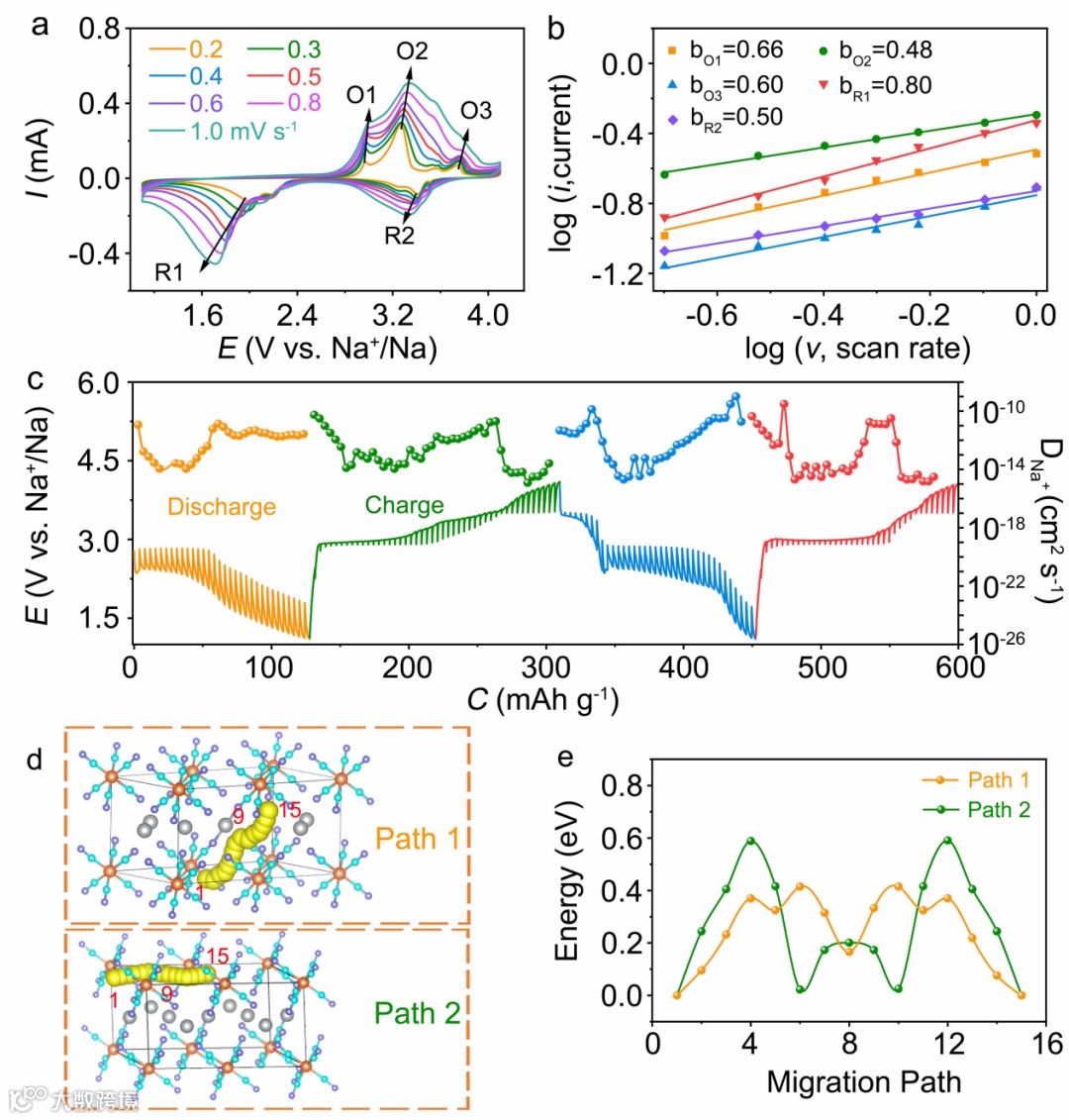 为更好地理解AgHCF@CNTs的动力学行为,通过不同扫速的CV、GITT以及EIS等多种表征手段进行测试分析,结果表明AgHCF@CNTs具有优异的钠离子储存能力和快速的扩散动力学,进一步证明了其具有较高的电化学稳定性和倍率性能。