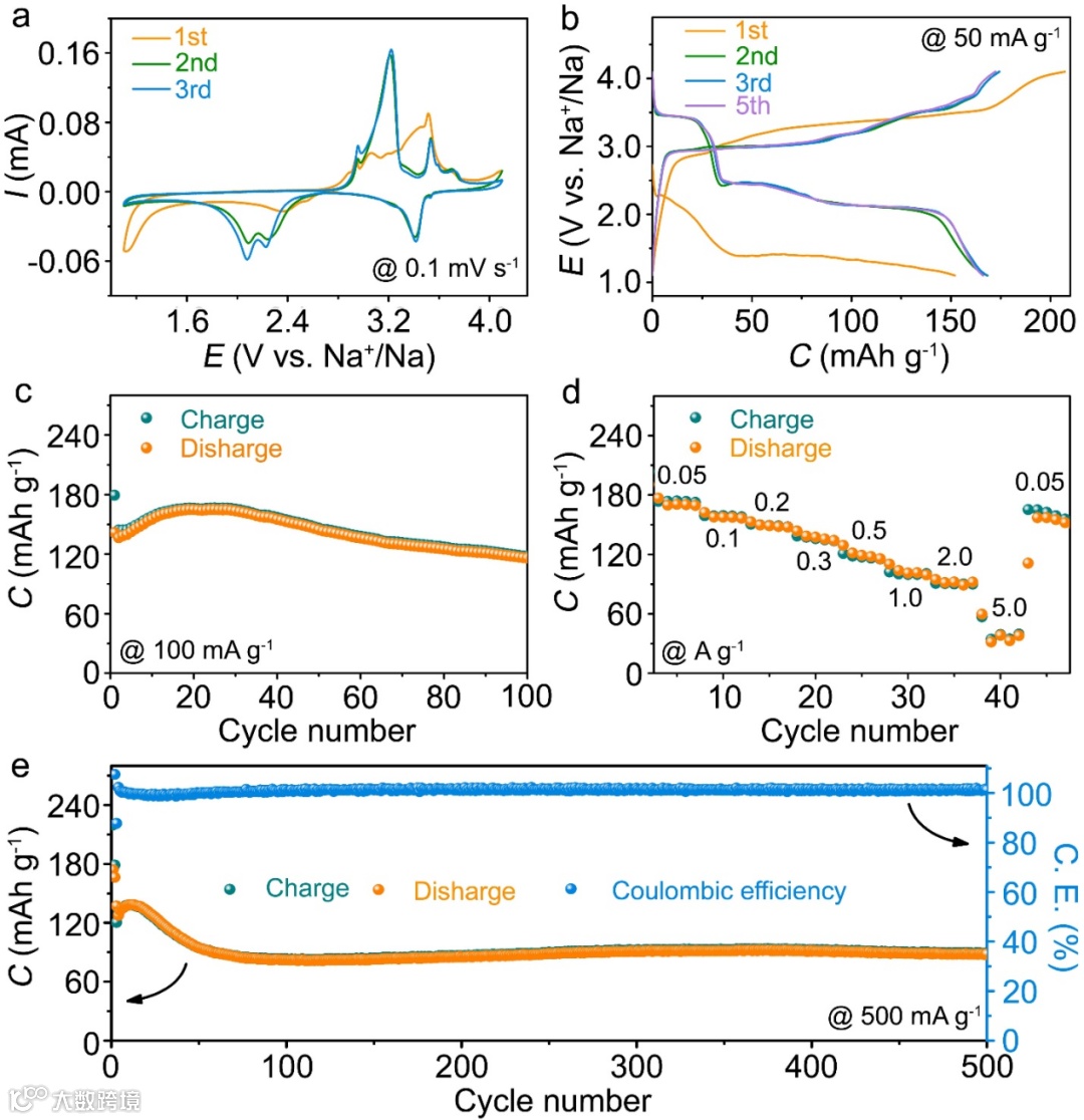 AgHCF@CNTs作为钠离子电池正极材料时,在50 mA g-1的电流密度下,发挥出168.4 mAh g-1的高比容量。其还表现出优异的倍率性能和循环稳定性,即使在2000 mA g-1的大电流密度下,仍能发挥出90.7 mAh g-1的容量。此外,其在500 mA g-1的电流密度下,循环500圈后,容量保持率为74%。