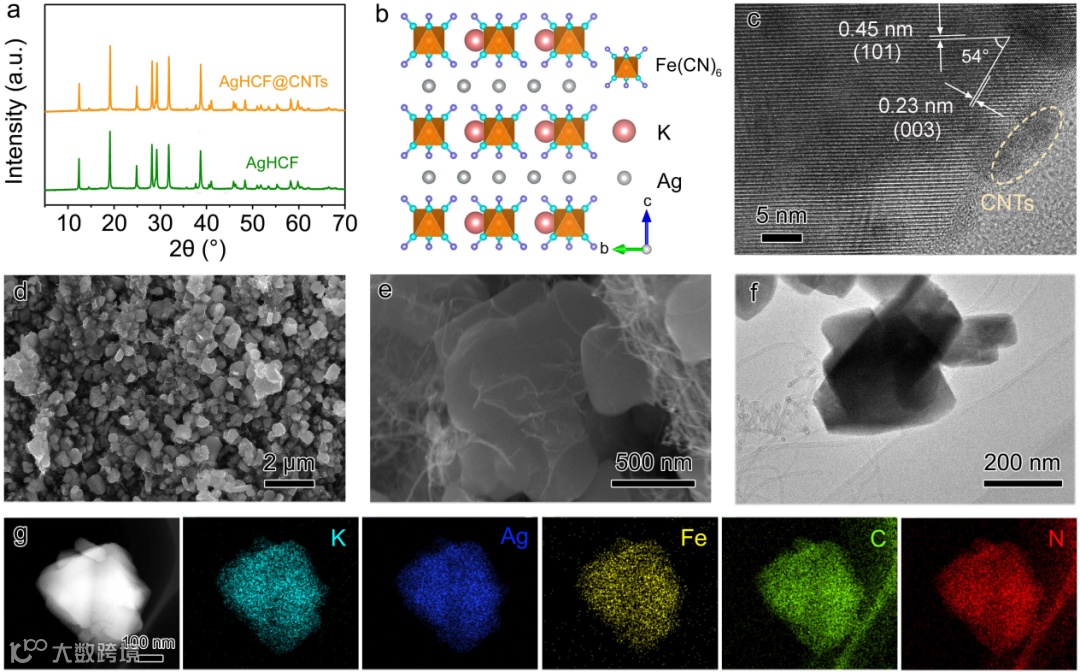 该研究通过X射线衍射仪(XRD)证实了材料的成功合成,尖锐的XRD衍射峰说明材料的高度结晶性。通过SEM和TEM图可以观察到,AgHCF纳米粒子尺寸在300-400 nm之间,碳纳米管如同链条连接着AgHCF纳米颗粒,确保了AgHCF@CNTs的高导电性。FTIR、Raman等测试以及DOS理论计算等证明了CNTs与AgHCF中的成功复合。结果表明,碳纳米管的加入没有改变AgHCF的结构和组成,并且提高了电子有效快速传导,从而保证了AgHCF@CNTs复合材料优异的循环稳定性和倍率性能。
