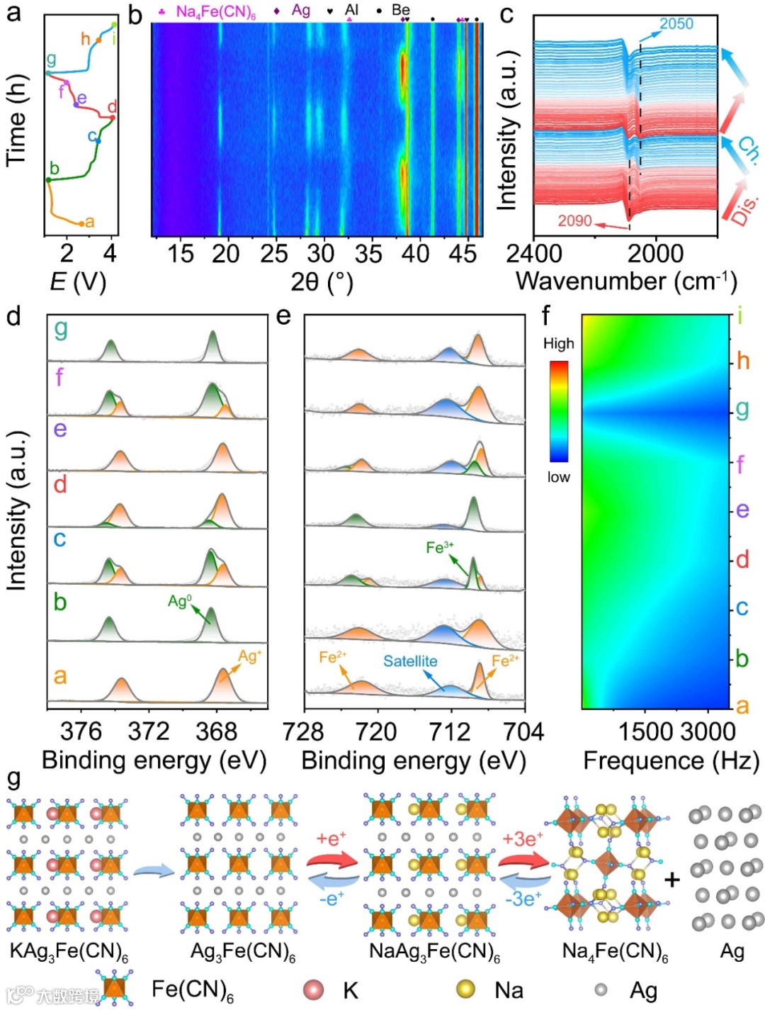 为了探寻AgHCF@CNTs的储钠机制,通过原位XRD测试、原位红外测试以及非原位X射线光电子光谱测试对其在充放电过程中元素价态及晶体结构变化进行分析。结果表明,该AgHCF@CNTs的储钠机制分为两步,第一圈充电过程中K+从结构中的脱出后;在随后的充放电过程中,Ag+的还原/氧化和Na+的嵌入/脱出导致Ag3Fe(CN)6和Na4Fe(CN)6 + Ag之间的可逆相变。整个充放电过程具有高度可逆性,涉及四电子转移电化学反应,确保了电极的高比容量和长循环稳定性。