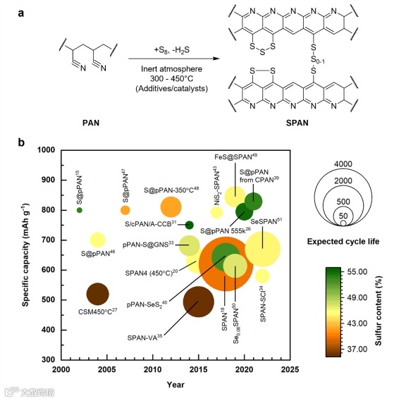 将高容量硫转化为增加电池能量密度的一个重要但通常被忽视的条件是稀释电解质操作,传统的硫氧化还原机制(即可溶性多硫化物辅助)对此构成了巨大挑战。当电解液用量有限时,可溶性多硫化物对电解质电导率、粘度、与锂阳极的反应性等的不利影响是显着且不可避免的。硫化聚丙烯腈(SPAN)阴极以其无多硫氧化物的氧化还原机理和出色的循环稳定性而闻名,是解决此问题的一种有效方法。