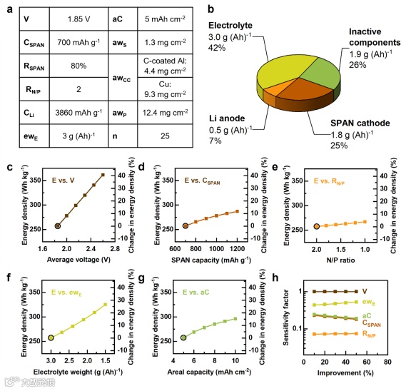图2.Li/SPAN电池级能量密度分析:起点(a);重量分布(b);电压(c)、SPAN容量(d)、N/P比(e)、电解液重量(f)和面容量(g)对能量密度及其敏感因子(h)的影响。