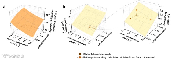 图4.所需的锂扩散系数 (a) 和电导率 (b) 以避免在 1.0 mA cm-2 和 5.0 mAh cm-2 下镀锂/剥离过程中 Li+ 耗尽。