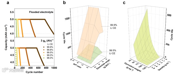 图3.Li/SPAN循环寿命分析:模拟循环性能(a);电池设计参数的影响(b);和副反应(电)化学(c)的影响。