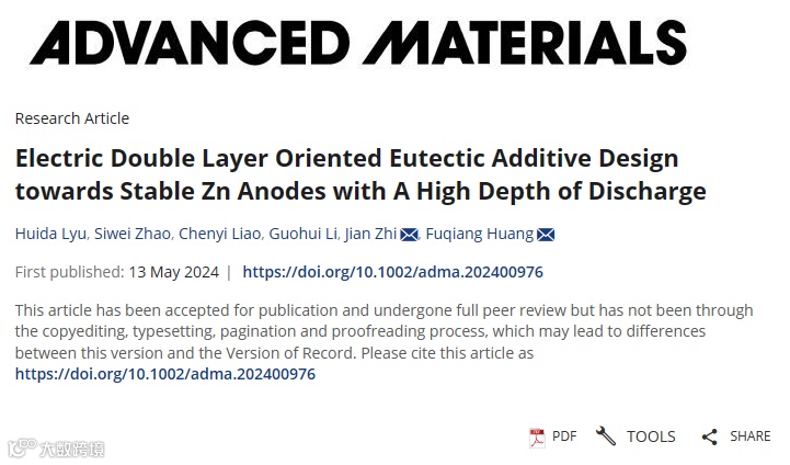 近日,来自上海交通大学材料科学与工程学院的黄富强教授与中科院上海硅酸盐研究所支键研究员合作,在国际知名期刊Advanced Materials上发表题为“Electric Double Layer Oriented Eutectic Additive Design towards Stable Zn Anodes with A High Depth of Discharge”的研究论文,首次报道了一种双电层导向共晶添加剂,实现了高稳定、高放电深度金属锌负极的构筑。