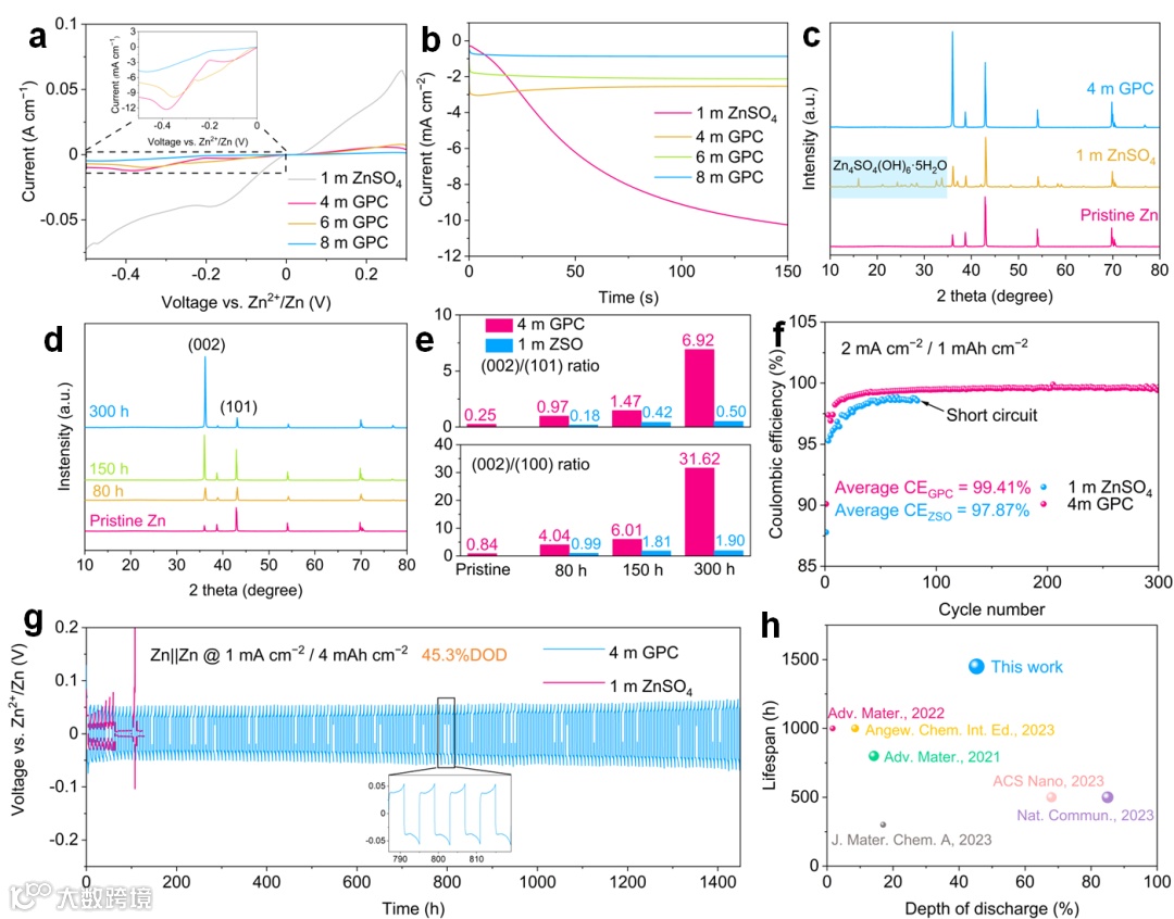 图2. 基于GPC的水系共晶电解液中的可逆锌金属负极。