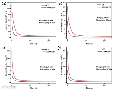 图4. CF电极以及MnO2@CF复合电容性电极在充电10min(a)、20min(b)、30min(c)、40min(d)后放电10min的计时充放电曲线