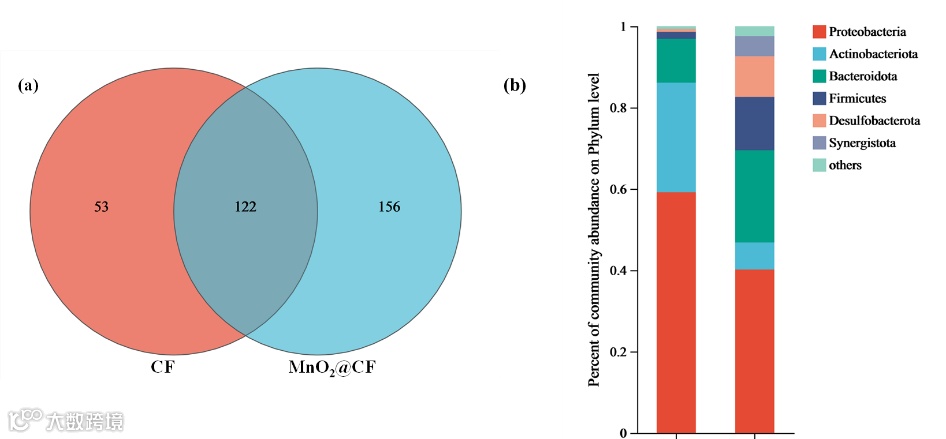 图7. 不同生物阳极上微生物群落OTUs重叠(a)和在门水平上微生物群落分布(b)