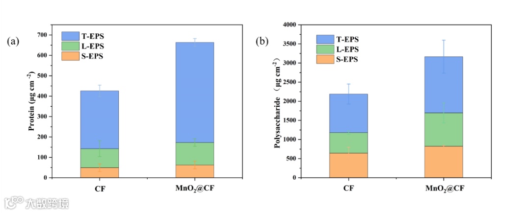 图5. CF电极以及MnO2@CF复合电容性电极蛋白质(a)、多糖(b)中不同EPS的含量