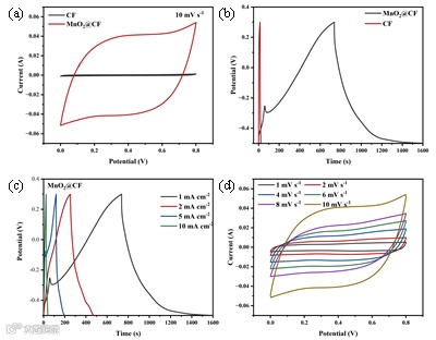 图3. CF电极及MnO2@CF复合电容性电极的CV曲线(a)、GCD曲线(b)、不同电流密度下MnO2@CF电极的GCD曲线(c)和不同扫速下MnO2@CF电极的CV曲线