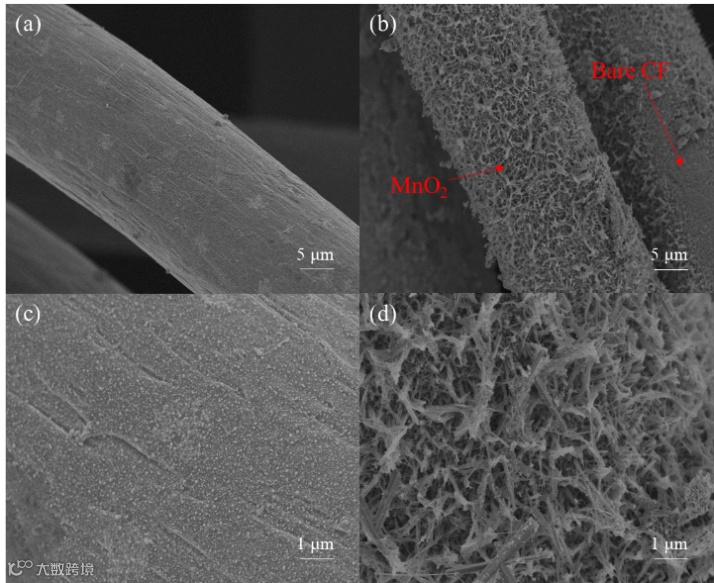 图2. 未修饰碳毡(CF)电极(a、c)以及MnO2@CF复合电容性电极(b、d)的SEM图像