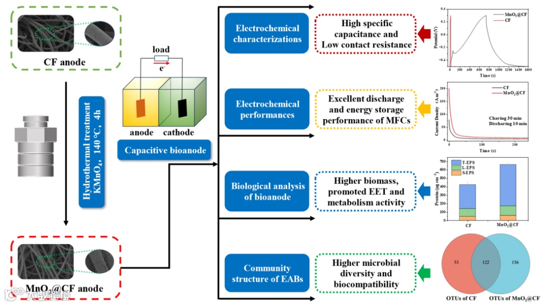 在这项研究中,我们通过水热法将棒状MnO2负载在CF上制备了一种低成本、高性能的电容性电极。在1 mA cm-2下,MnO2@CF的比电容(229.72 mF cm-2)是未修饰CF的56.03倍。MnO2@CF组装的微生物燃料电池(MFC)的功率密度为2754.15 mW m-2,是CF组装的MFC功率密度的6.21倍;同时充电30 min后可释放2625.23 C m-2的电量,是CF组装的MFC的2.82倍。MnO2的加入显著增加了电极的比表面积,为电活性微生物提供了适宜的生长环境,提高了阳极电活性生物膜的生物量,为提高以MnO2@CF为阳极的MFC系统的产电性能和电容奠定了坚实的基础。高通量测序表明,MnO2@CF生物阳极上的优势菌群为常见的电化学活性微生物(Proteobacteria, 40.15%)和Bacteroidetes(22.68%),有助于电子供体的厌氧消化,提高了阳极电活性生物膜的底物利用效率,从而促进了MFC的稳定运行。因此,与未修饰CF阳极相比,使用MnO2@CF电容性电极组装的MFC具有更高、更稳定的产电性能、功率密度以及储能能力。