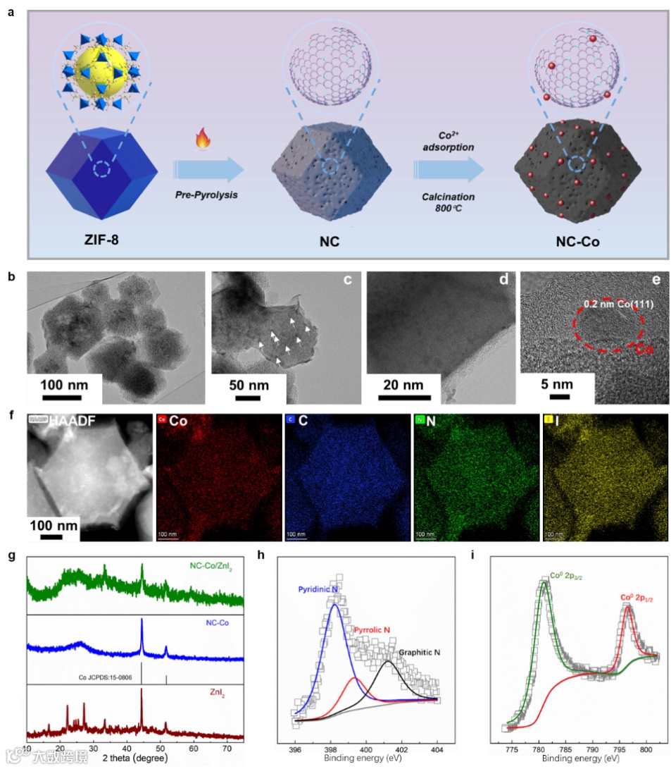 作者首先通过在N2气氛下直接热解ZIF-8制备多孔N掺杂碳 (NC)。随后,将 NC 粉末分散在 Co(NO3)2 溶液中,以获得在纳米孔中填充 Co(II) 的前驱体。并将该前驱体在氮气/氢气流中进行第二次热活化后,最终将得到的产物命名为 NC-Co。NC-Co保持规则的菱形十二面体形态并均匀负载的Co纳米颗粒。HAADF-STEM图像和相应的EDX元素图表明了ZnI2负载后NC-Co复合材料中C、N、Co、I元素的均匀分布,进一步证实了ZnI2负载在NC-Co的孔隙中。