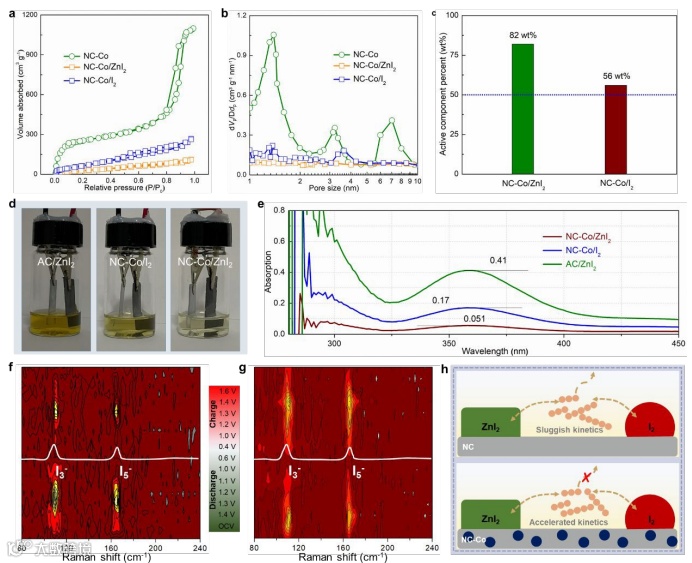 作者介绍NC-Co具有丰富的极性氮和钴位点,可以通过分子间偶极-偶极相互作用增强与同极性分子ZnI2的分子间相互作用力,从而实现ZnI2的化学吸附。因此,碘化锌的负载量高达 82%。通过可视化小瓶实验中比较了三种电极的电解质的颜色,表明NC-Co/ZnI2和AC/ZnI2之间的差异归因于 NC-Co对聚碘化物的化学亲和力,可以更好地限制可溶性聚碘化物的释放。此外,循环过程中碘的不断体积膨胀以及在电解液中的严重溶解导致NC-Co/I2正极对聚碘化物的无效锁定。紫外-可见光谱结果进一步量化了上述推测。Co催化中心的强催化作用促进了快速的碘氧化还原转化,同时加强了对多碘化物穿梭的抑制。