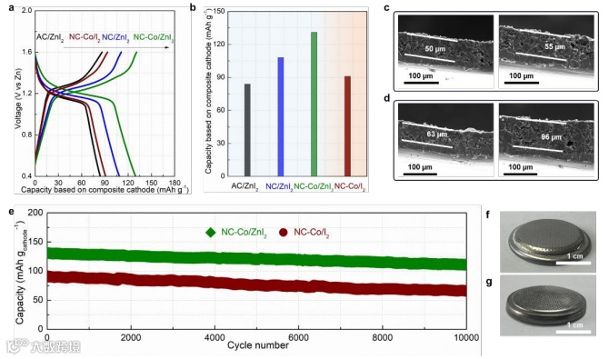 作者进行电化学测量以评估正极成分对Zn-I2电池电化学性能的影响。为了获得实际相关的结果,所有比容量和电流密度都根据电池中复合正极的质量进行归一化处理,NC-Co/ZnI2 能实现高达130 mAh g-1的容量。此外,NC-Co/ZnI2电极的厚度在循环后几乎保持不变,而NC-Co/I2电极的厚度膨胀率约为52.4%。这种差异表明,ZnI2阴极在脱锌过程中的初始收缩可以最大限度地减少连续体积膨胀并保持电极的高稳定性。NC-Co/ZnI2 正极在1C下超长循环超过10000次循环后,容量保持率高达85.4%,这优于 NC-Co/I2 电极72.1%的有限容量保持率。