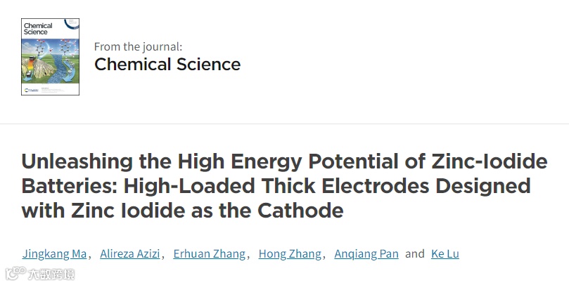 Jingkang Ma (马靖康), Alireza Azizi, Erhuan Zhang (张二欢), Hong Zhang* (张红), Anqiang Pan* (潘安强), and Ke Lu* (鹿可), Unleashing the High Energy Potential of Zinc-Iodide Batteries: High-Loaded Thick Electrodes Designed with Zinc Iodide as the Cathode, Chemical Science, 2024, 10.1039/D4SC00276H.