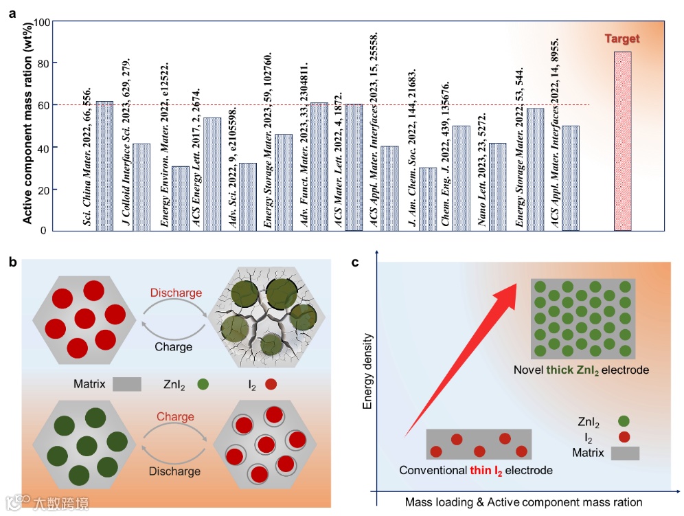 水性锌碘 (Zn-I2) 电池因其能量/功率密度高、安全性高、成本低和广泛可用性等显着属性而成为大规模储能设备的有希望的候选者。然而,活性成分的利用率有限以及重复放电/充电过程中碘的显着体积膨胀仍是与碘阴极相关的一些关键的固有问题。尽管在设计成分和复合碘阴极的结构为提高碘利用率提供了可能的解决方案,但正极材料在比容量和活性材料含量之间存在权衡,从而损害了 Zn-I2 电池的可用比能。