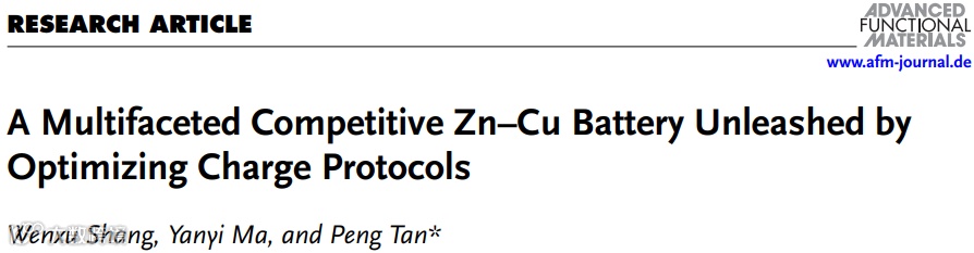 近日,来自中国科学技术大学的谈鹏教授和深空探测全国重点实验室的尚文旭助理研究员在国际知名期刊Advanced Functional Materials上发表题为“A multifaceted competitive Zn-Cu battery unleashed by optimizing charge protocols”的研究文章。该研究文章通过调控充放电协议有效提升了电池的循环稳定性,并提升了铜电极的活性物质利用率。