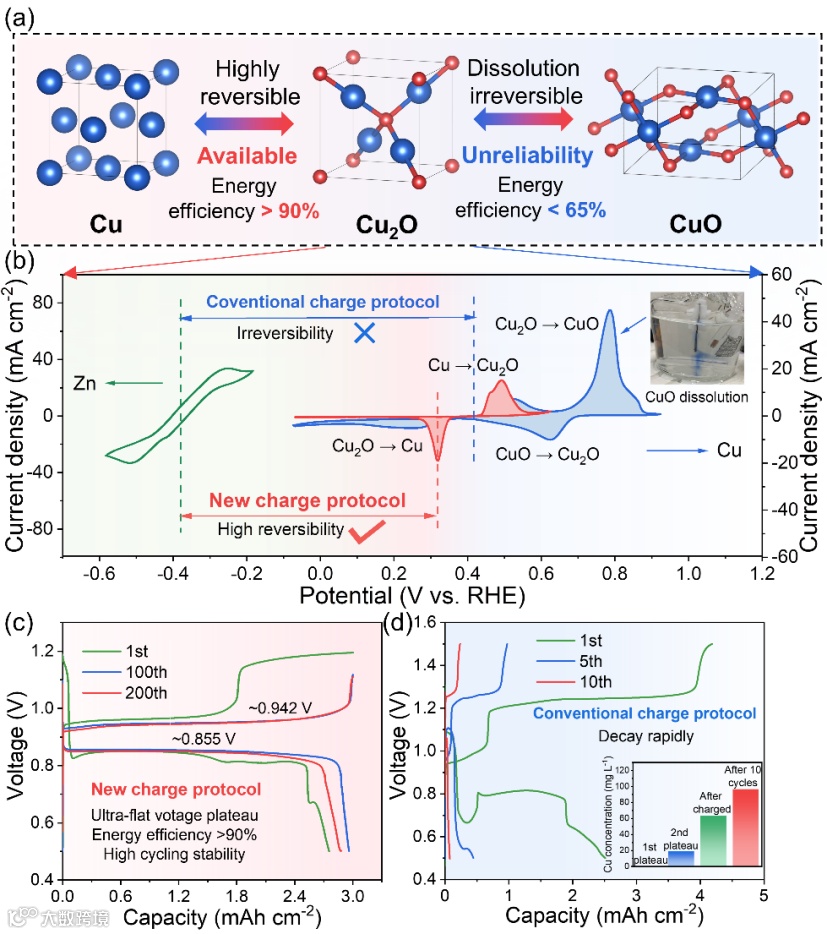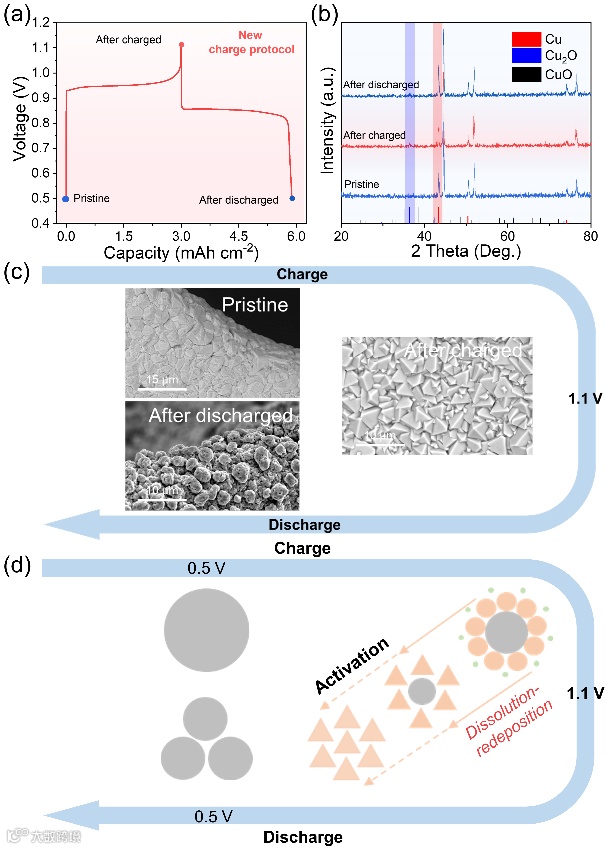 早在1836年,英国科学家丹尼尔就发明了酸性锌铜电池,但其一直被视为一次电池而未能得到广泛研究。今年来,研究人员发现通过适当调控碱性电解质浓度,可使得铜电极实现可充电化,赋予了锌铜电池二次生命。然而,目前的碱性锌铜电池受制于铜电极的溶解性,充放电可逆性问题成为一个关键问题。本工作系统研究了铜电极在充电过程中的溶解特性,揭示了其在高电压下的溶解机理。基于此,提出了一种基于部分溶解-沉积机理的电池充电协议,一方面通过前期自活化实现了高活性物质利用率,另一方面有效提升了电池的充放电循环稳定性(400周循环,无明显衰减)。该工作为未来低成本、高能量密度动力电池的研究提供了方向,有助于加速锌基电池体系商业化应用。