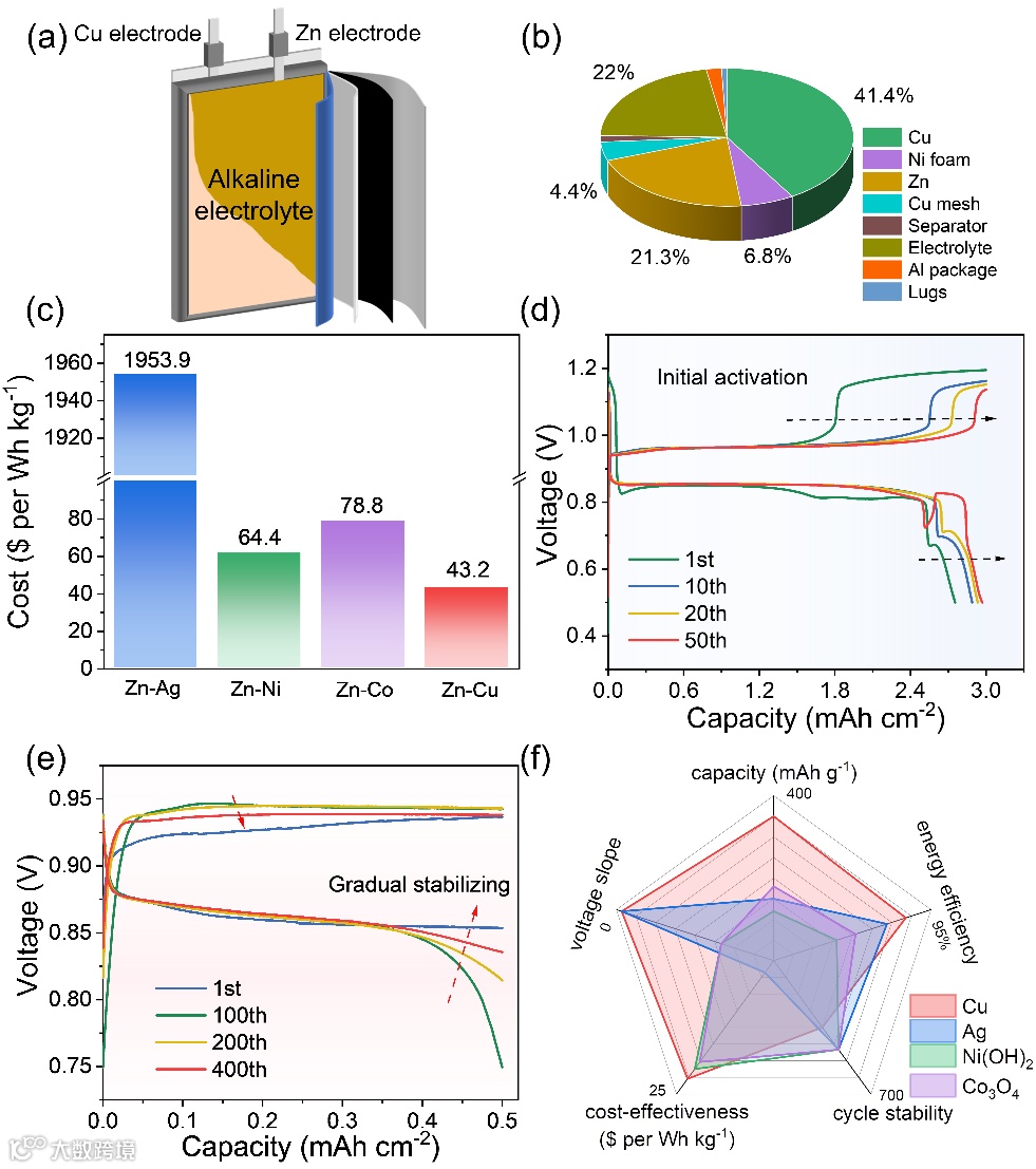 作者测试并评估了经过充电协议调整后锌铜电池在五个维度的优势提升:1)容量:放电比容量达到了349.5 mAh g–1;2)电压斜率:超平的电压曲线;3)能量效率:峰值能量效率高达92%;4)成本:每千瓦时只需43.25美元;5)循环稳定性:超过400周循环没有明显的性能衰减,为未来实际应用奠定了基础。