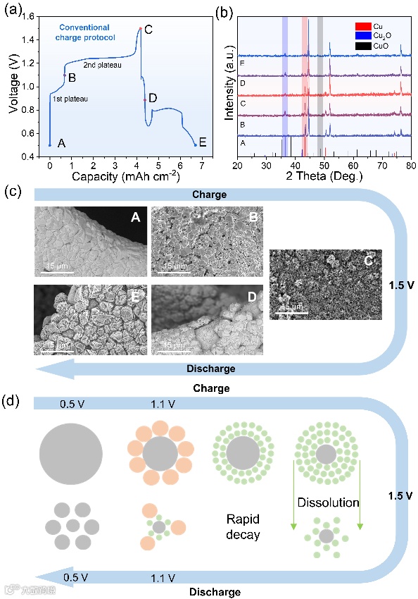 作者对铜电极在不同充电协议下充放电循环过程中的结构和形态变化进行了研究。对于原始充电区间,在高电压区域CuO与碱性电解质反应产生Cu(OH)42–(aq)而溶解进电解质中,导致电极表面出现缺陷和蜂窝状结构,最终导致铜电极的溶解和不可逆性。对于新充电协议区间,电极在充放电过程中表现出极好的可逆性,且基于部分溶解-沉积机制,有效提升了电极的容量。