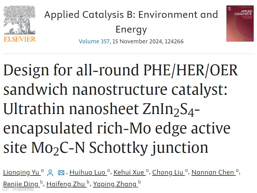 近日,中国石油大学(华东)于濂清教授,在国际知名期刊Applied Catalysis B-Environmental and Energy上发表题为“Design for All-round PHE/HER/OER Sandwich Nanostructure Catalyst: Ultrathin nanosheet ZnIn2S4-Encapsulated Rich-Mo Edge Active Site Mo2C-N Schottky Junction”的文章。本工作揭示了Mo2C-N/ZIS肖特基结通过构建局部电场和丰富的边缘活性位点加速了电荷迁移和降低中间体和催化剂的反应能垒,有效地增强PHE/HER/OER活性。研究为设计高性价比的PHE/HER/OER及其他相关能源转化的助催化剂提供了创新思路。