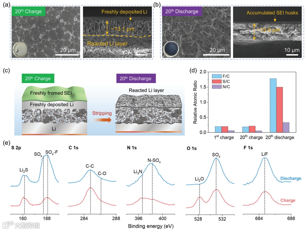 在循环过程中,SEI空壳的积累形成常见的死锂层,其组成可能与新形成的SEI不同。本文对不同循环圈数后LHCE中形成SEI成分的变化进行了分析。首先,我们发现一个独特的锂沉积现象:新的锂沉积层覆盖于死锂层之上,而且在弱溶剂化电解液中也出现了这一现象,但在常规碳酸酯类电解液中未出现,说明这一独特现象与富阴离子溶剂化结构有关。XPS结果发现第1次充电和第20次充电后的SEI样品中F/C、S/C和N/C比值和化学物种基本一致,这表明在前20个循环中新形成的SEI的成分变化微乎其微。然而,与第20次充电态相比,第20次放电态SEI样品中的F/C、S/C和N/C原子比分别增加了836%、619%和560%,表明死锂层中无机物(LiF、Li2S、Li3N等)远高于新形成SEI。这是由于新形成的SEI中的聚合物成分会溶解在电解液中,而溶解度低的无机物会在每次放电过程后积累起来,从而形成富含无机物的死锂层。经核查,多数以往研究中报道的“富无机阴离子衍生SEI”实际上表征的是循环后的死锂层。换言之,新形成的SEI中阴离子衍生无机物的含量很低(N,S的原子比甚至低于1%)。