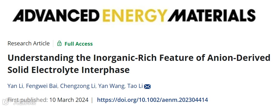 近日,南华大学李滔副教授团队在国际知名期刊Advanced Energy Materials上发表题为“Understanding the Inorganic-Rich Feature of Anion-Derived Solid Electrolyte Interphase”的观点文章。文章揭示了新形成的阴离子衍生SEI由富含有机组分的表层和富含无机组分的里层组成。有机组分在放电过程中溶解,而溶解度低的无机组分保留在“SEI空壳“中。在循环过程中, ”SEI空壳“的积累形成了死锂层,其中无机组分含量远高于新形成的SEI。文献中常见的“阴离子衍生富无机SEI”这一表述实际上是指循环后死锂层(或者循环数圈后有“SEI空壳“残留在新形成的SEI上造成检测结果中无机组分偏高)。为了避免误解,在表征SEI时,要区分新形成的SEI和死锂层,我们建议应该对新形成的SEI特征进行表征,因为循环多圈后覆盖的死锂层并不能反应工作状态的真实SEI。这项工作为阴离子衍生SEI的组成特征提供了新的见解。