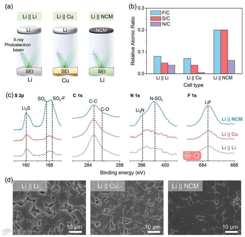本文以代表性的LHCE(LiFSI-DME-TTE, 1:1.2:1.8, mol)衍生的SEI为例,研究三种电池类型(Li||Li、Li||Cu和Li||NCM)对阴离子衍生SEI组分的影响。SEI中F/C、N/C和S/C的比值反映了阴离子/溶剂的相对分解程度,因为F、N和S为阴离子(FSI−)所特有,而C为溶剂(DME)所特有。研究结果表明,Li||NCM电池中形成的SEI的F/C、N/C和S/C比值是Li||Li和Li||Cu电池的两倍以上,说明与在低电压下工作的Li||Li和Li||Cu电池相比4.3 V Li||NCM电池中有更多的阴离子参与分解。考虑到这一点,我们建议采用Li||NCM中所形成的SEI进行研究,因为它反映了实际应用工作条件下SEI的真实特征,换言之,Li||Li和Li||Cu中形成的SEI并不能如实反应实际应用场景中的真实SEI。