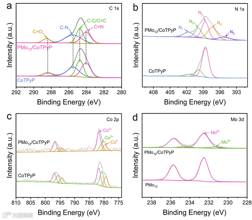 图3 CoTPyP和PMo12/CoTPyP的 (a) C 1s,(b) N 1s,(c) Co 2p和 (d) Mo 3d光谱