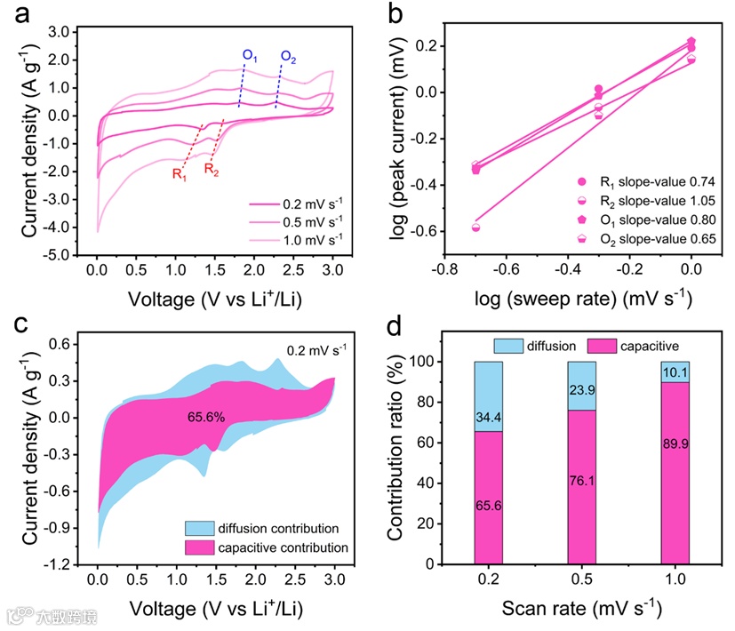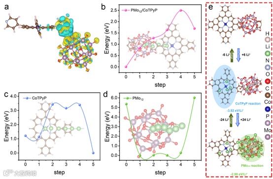 通过电化学阻抗谱 (EIS)、赝电容贡献分析、GITT、DFT计算等手段揭示了共组装创造的sub-1 nm通道、POMs和卟啉的协同效应实现活性位点的充分暴露,结合POMs和卟啉各自优势,提高了整个材料的电子/离子导电性,增加了Li+存储容量和氧化还原反应速率。